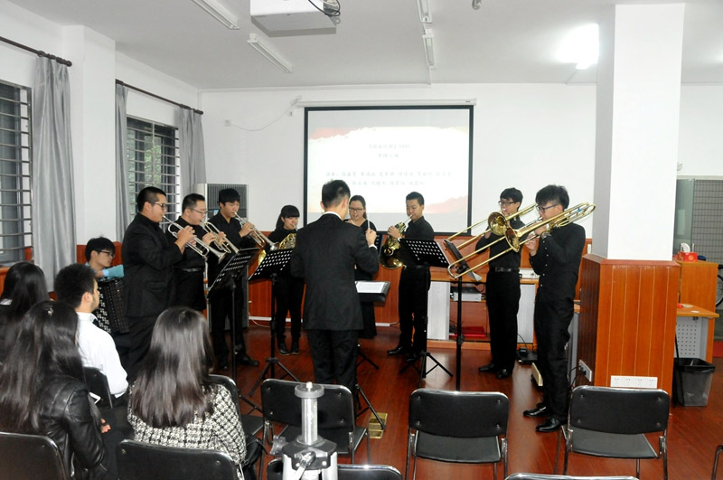 讲座以讲演结合的方式展开,通过介绍抗日救亡运动中上音师生创作的经典战歌及其背后的故事,并结合校史馆志愿者们的专业所长,以铜管乐重奏、合唱、独唱等形式分别献演了萧友梅的《国耻歌》(1928)、黄自《抗敌歌》(1931)《九一八》(1933)、贺绿汀《游击队歌》(1937)《嘉陵江上》(1939)、何士德《新四军军歌》(1939)等优秀作品,受到在座师生的热烈好评;周小燕先生当年演唱《长城谣》(刘雪庵 1937)珍贵历史视频的播放,更是掀起了本场讲座的小高潮。