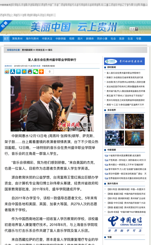 2016年12月12日,由上海音乐学院现代器乐与打击乐系、贵州盛华学院共同举办的“贵州盛华职业学院盲人音乐学院暨盲人乐团成立音乐会”在贵州省惠水县的贵州盛华学院隆重举行;本次活动的成功举办,标志着酝酿和筹备两年左右的,国内唯一的一家专为盲人音乐教育事业开设的专业音乐院校正式成立。此举收到了社会各界的高度关注,贵州省残联副理事长陈健、贵州省惠水县县委领导均出席了本次活动;新华社、中新社、贵州都市报、贵州电视台五频道也分别作了相应报道。
