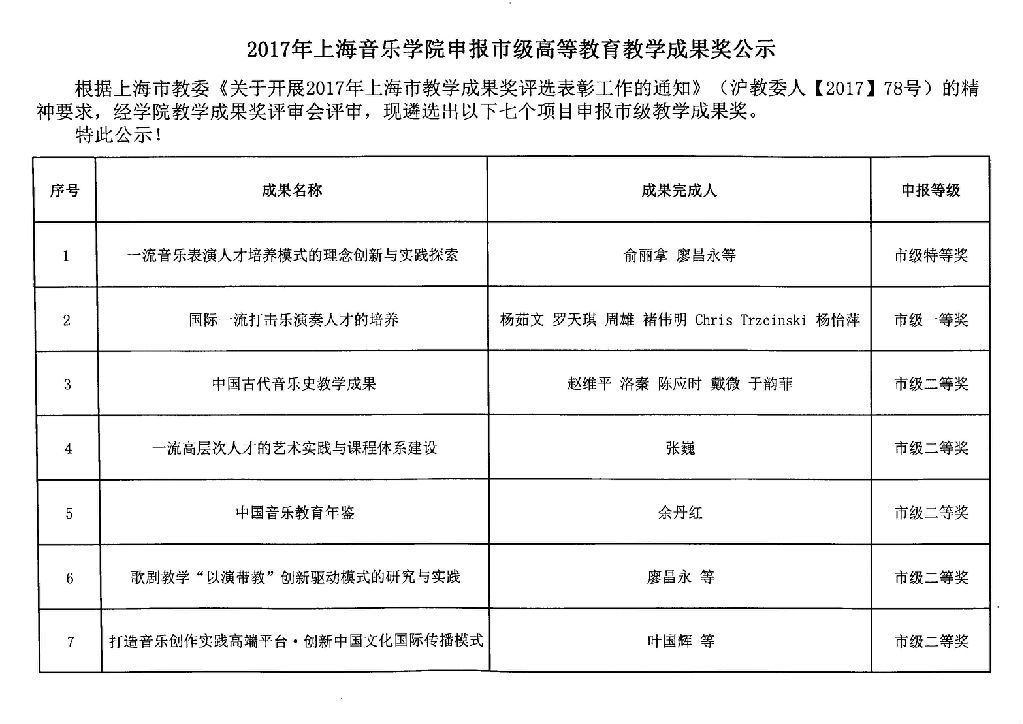 2017年上海音乐学院申报市级高等教育教学成果奖公示
