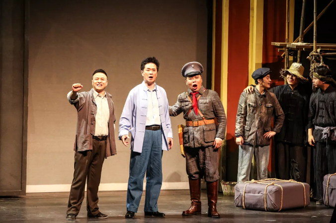如何处理戏剧冲突不在一个集中的时间节点,是歌剧写人物传记的难点。青年编剧陆驾云在研究贺老史料方面下了功夫,通过截取贺老一生中最具戏剧性的片断,既真实地反映他的主要经历,又巧用人生转折点,形成戏剧张力。如第一幕所展现的帝国主义和封建主义对人民的压迫,已到了一个临界点,英国军舰在四川杀害中国军民上千人的消息传来,激怒了邵阳民众,发生了焚烧英国洋行、油库这样的真实事件。把这种舞台上富有表现力的冲突,与贺老早期参加农民运动的经历结合在了一起。又如在上海求学期间和成名以后,面对主张全盘西化、蔑视中国音乐和中国文化的心态,与自身艺术理念形成的强烈冲突,贺绿汀的愤懑和坚持喷薄而出,戏剧冲突也层层递进。