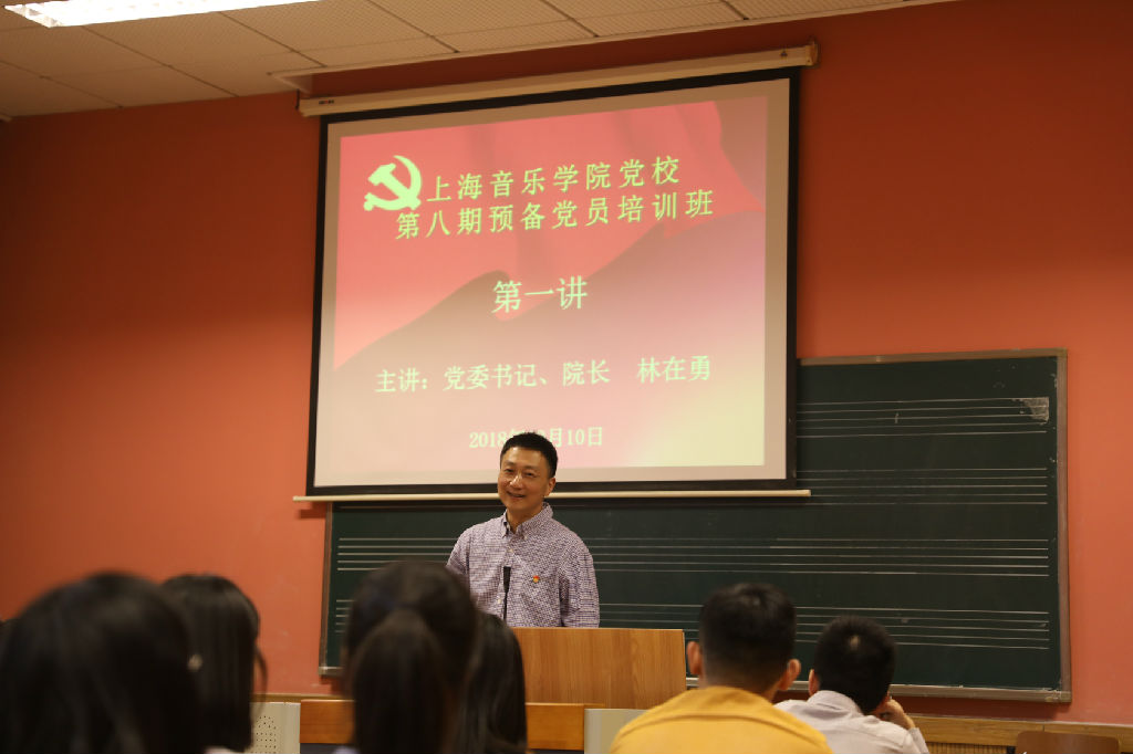 2018年10月10日下午,上海音乐学院党校举行第八期预备党员培训班,邀请上海音乐学院党委书记、院长林在勇为预备党员上第一堂党课。来自13个系部的33名教师、学生预备党员参加培训。