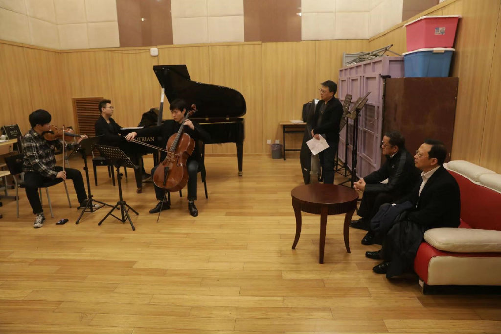 随后教委专家在排演中心聆听了中心青年演奏家“棱境三重奏”(耿文彬、朱宛晨、张润崯)演奏的《施耐德三重奏》。“棱境三重奏”技艺高超的演奏给教委专家留下了深刻印象,获得一致好评。