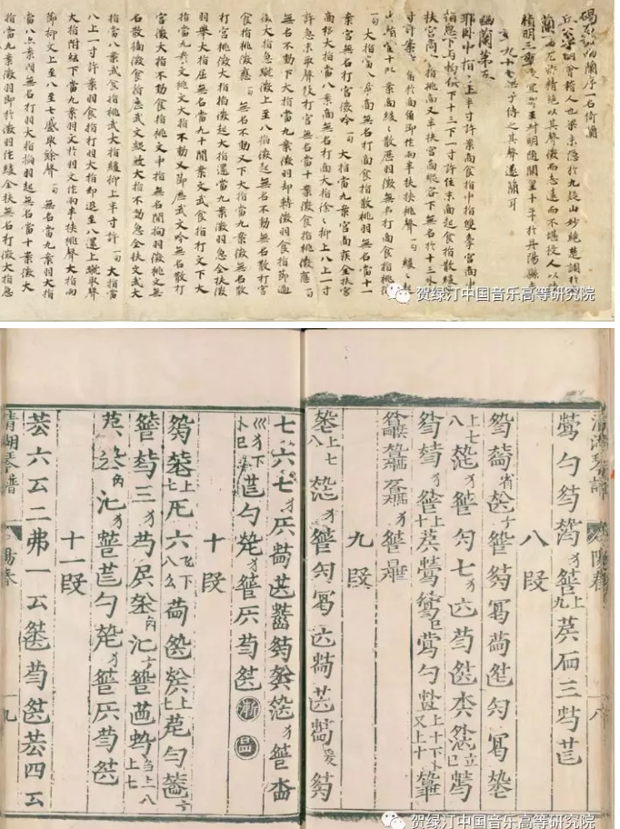 中国器乐谱的发展路径与乐器本身的命运休戚相关。就古琴谱而言,目前发现的唐人抄本六世纪梁代丘明《碣石调·幽兰》(现藏于东京国立博物馆)是至今发现最早的文字叙述谱。到了唐代在曹柔、陈拙等的努力下进行了古琴谱改革,出现了减字谱,这种一个谱字一个音高的减字谱一直到明清才彻底定型完成。古琴谱始于唐代,其规模性的出现却是在明代,也就是说从唐到明清的一千年间古琴谱遵循琴自身规律逐渐形成,这与琴本身的形制自汉代七弦十三徽定型以来,至今没有出现革命性的变迁有着重要的内在关联。