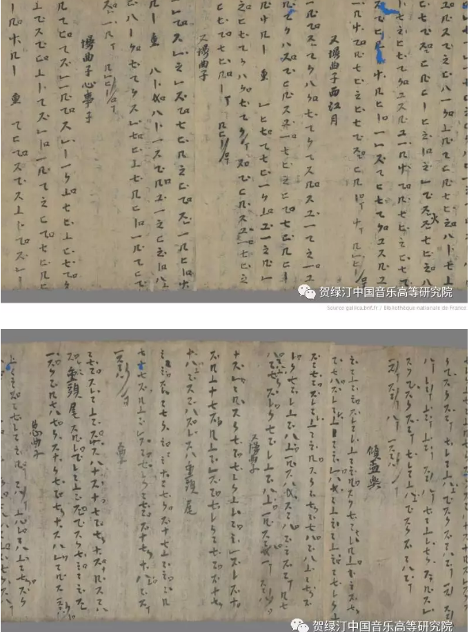 但是,琵琶谱、横笛谱、筝谱、笙谱等却不同于古琴谱,上述乐器尤其在唐代以后其形制、演奏方法等都发生了变迁,它们的乐谱也随之消失。进入了二十世纪在敦煌藏经洞(第17窟)中发现的琵琶谱(长兴四年,933),被称之为《敦煌琵琶谱》(现藏于法国巴黎国家图书馆,BnF)是深藏了近千年后被发现的古人遗物。这份乐谱尽管在中国沉睡了千年,但之后还是流向了海外。实际上我国除古琴谱外,唐代前后的乐谱可以说荡然无存。中国有着丰富的乐谱资源,遗憾的是这些古谱没有得以传承,一个乐谱起源国沦为“贫谱”之国实在令人歔欷惋惜。那么,如此丰富的古谱资源都流向了何处呢?随着日本遣唐使的来朝,一些音乐使者将中国当时的乐器、乐舞、乐谱等带回了日本,他们视中国唐代艺术为上等的舶来品精心珍藏,通过日本雅乐这一路径一直继承、传播至今。以上所述的琵琶谱、笙谱、筝谱、横笛谱、筚篥谱等大部分散见于日本多个博物馆、音乐研究所、政府机关及学术机构等。