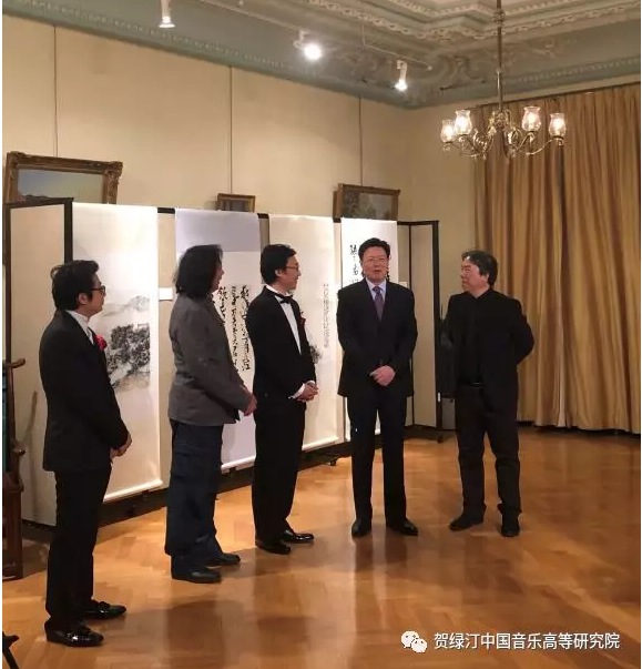 离音乐会开场还有一个多小时,剧院入口外已是人流涌动。希望通过廖昌永的演唱来感受中国传统文化魅力的宾客早已排起长队。远超预计的宾客纷至沓来,为了让更多人能多方位感受、了解中国文化的独特氛围,经过与音乐厅的反复协调,剧院终于破例同意以加座的方式迎接前来聆赏的听众。人头攒动、高朋满座,绕梁之音即将让这座落成于十九世纪后期的日内瓦沙龙剧院再次散发出夺目之光。沙龙剧院由音乐厅和展览厅组成。傍晚时分,观众首先被灯火通明的展览厅所吸引。两位书画艺术家的三十四件艺术作品在此揭开面纱。璀璨的聚光灯下,以音乐会中演唱曲目为主题的国画、书法和瓷器作品精心陈列,相互映衬,构成一组水墨淋漓、色彩斑斓、意境幽雅的中国传统艺术画卷:《阳关三叠》和《月满西楼》等国画作品中惟妙惟肖的人物场景;《我住长江头》和《忆秦娥·恒山月》等绘画中或是险峻、或是辽远的山水景致,无不令人赏心悦目。同时,豪迈挥洒、风格独到的书法作品也引得许多中外宾客驻足品鉴,感受其中的文字雅韵和流动美感。来自各文化地区的观众以中文、法文或英文热烈讨论,流连于浓厚的中国传统文化氛围当中,并对接下来的独唱音乐会再添期待。