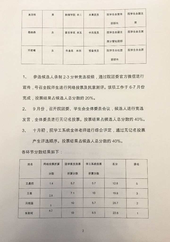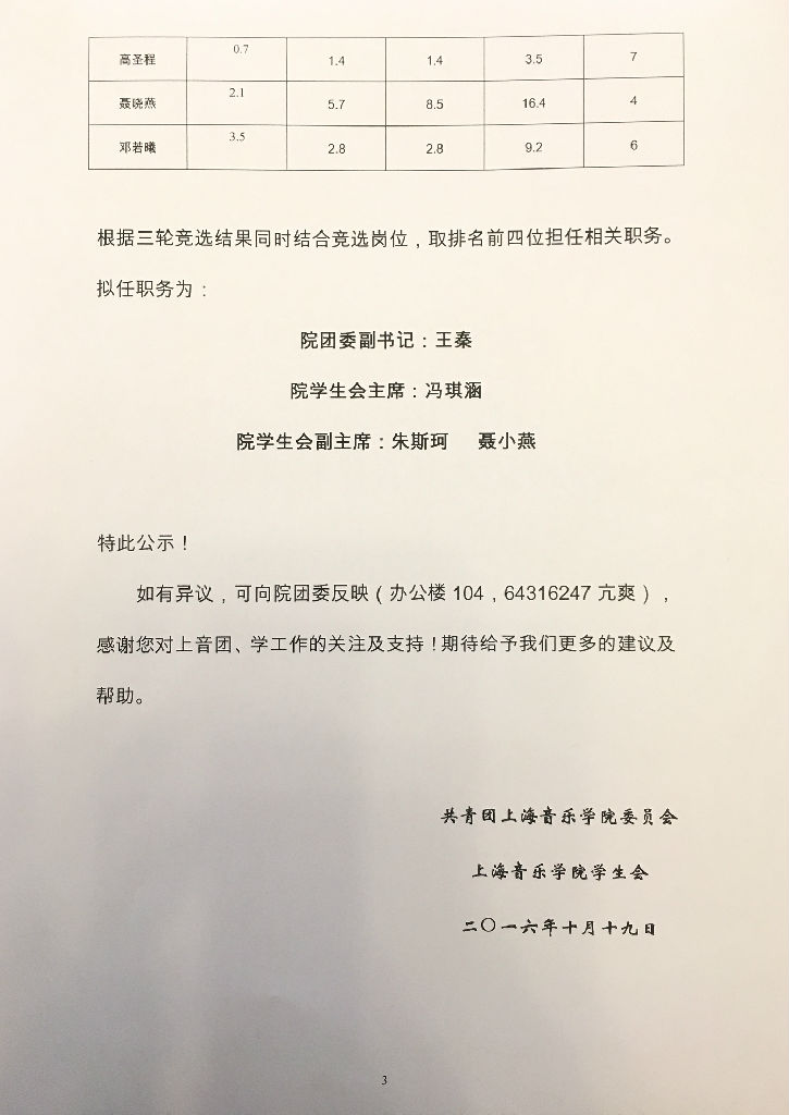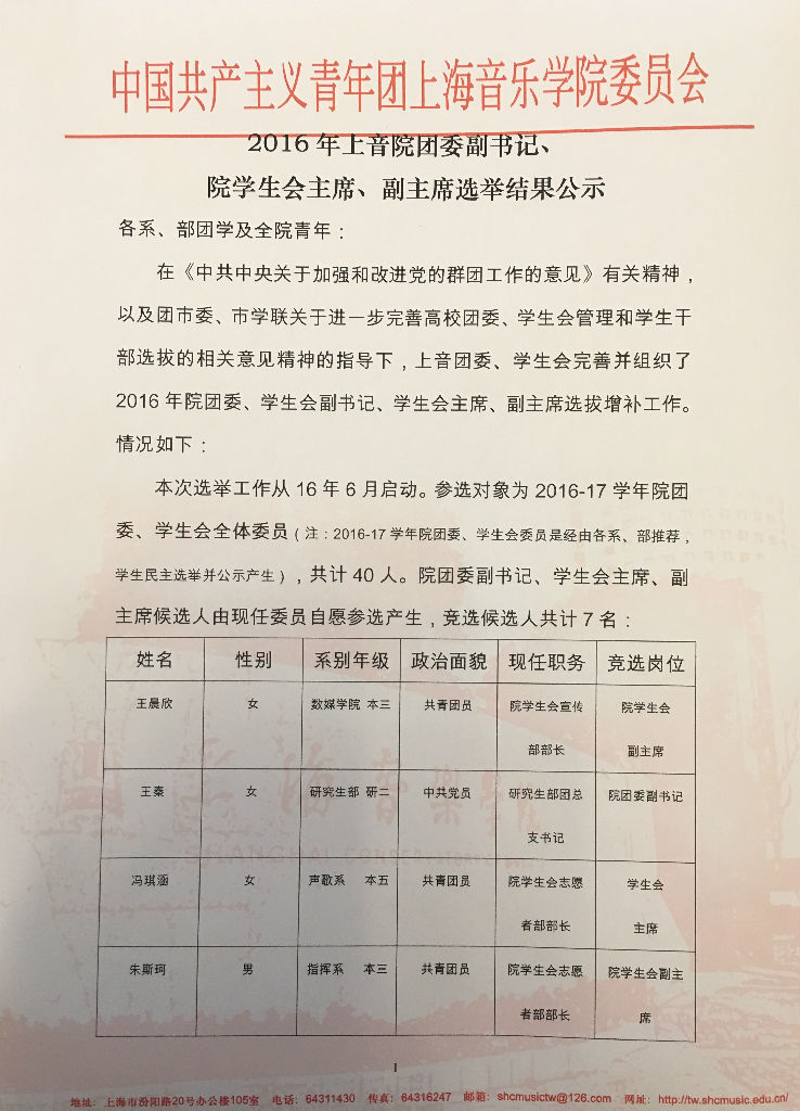 2016年上音院团委副书记、院学生会主席、副主席选举结果公示