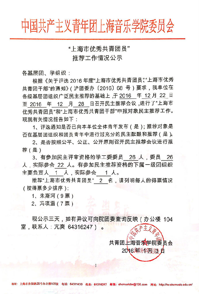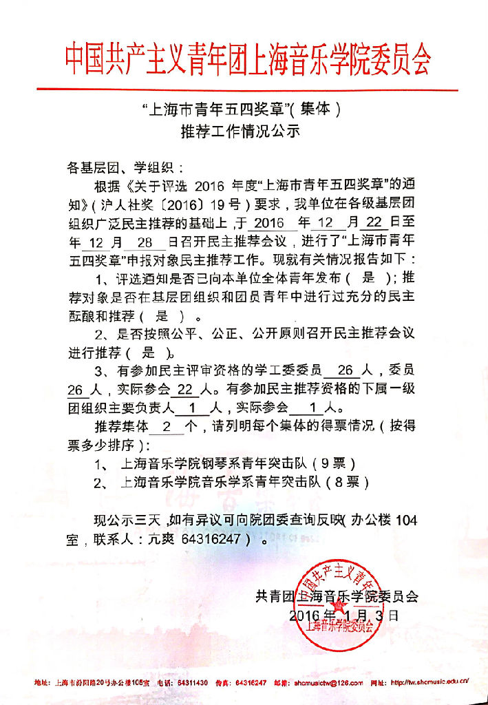 2016“上海市青年五四奖章”(集体)、“上海市优秀共青团员”推荐工作情况公示