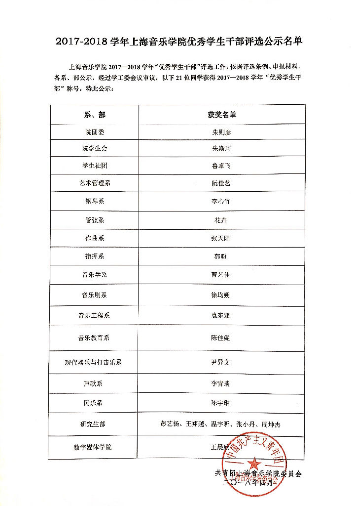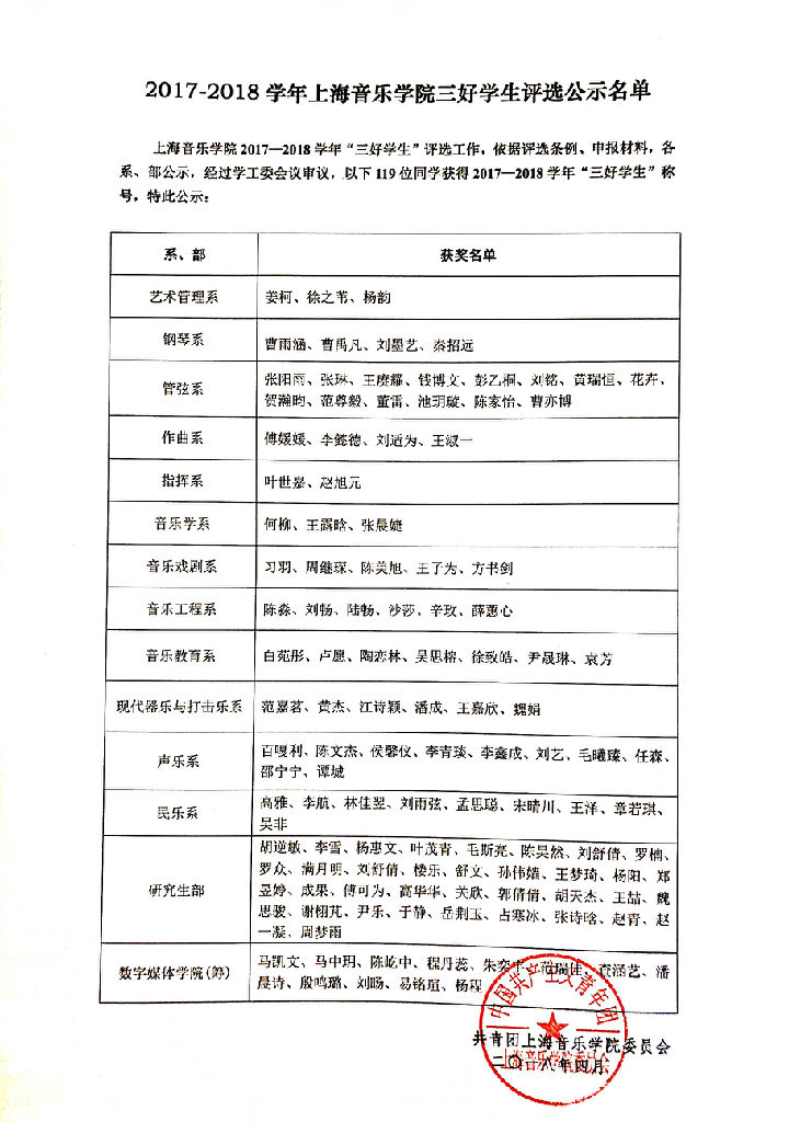 上海音乐学院2017年度 优秀团总支、三好学生、优秀学生干部 公示