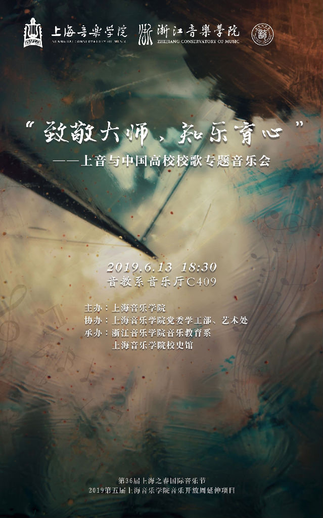 2019年6月13日,由上海音乐学院主办,党委学工部、艺术处协办,校史馆与浙江音乐学院音乐教育联合承办的第36届上海之春国际音乐节暨2019年第五届上海音乐学院音乐开放周延伸项目:“致敬大师,知乐育心”——上音与中国高校校歌专题交流活动在浙江音乐学院音教系成功举办。