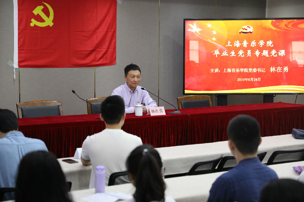 2019年6月24日下午,上海音乐学院举办毕业生党员教育活动。为进一步增强毕业生党员的组织观念、身份意识,提高毕业生党员的党性修养,由院党委书记林在勇为毕业生党员上专题党课。2019届近70名本科及研究生毕业生党员、专兼职组织员老师参加了本次党课。党课由院党委常委、组织部部长冯磊主持。