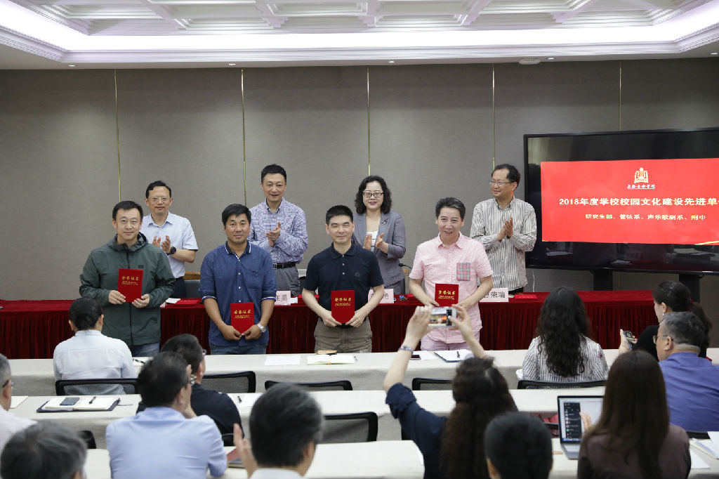 会议集中表彰了一批学校宣传思想工作方面的先进单位和个人。国际交流处、学工部、科研处、研究生部、统战部、教务处荣获2018年度学校新闻宣传工作先进单位,研究生部、管弦系、声乐歌剧系、附中荣获2018年度学校校园文化建设先进单位,民族音乐系、声乐歌剧系获批上海音乐学院课程思政教育教学改革整体试点单位。在去年纪念改革开放40周年征文活动中获奖代表、“海上音讯社”学生记者团优秀个人也上台领奖。刘艳宣读获奖名单。