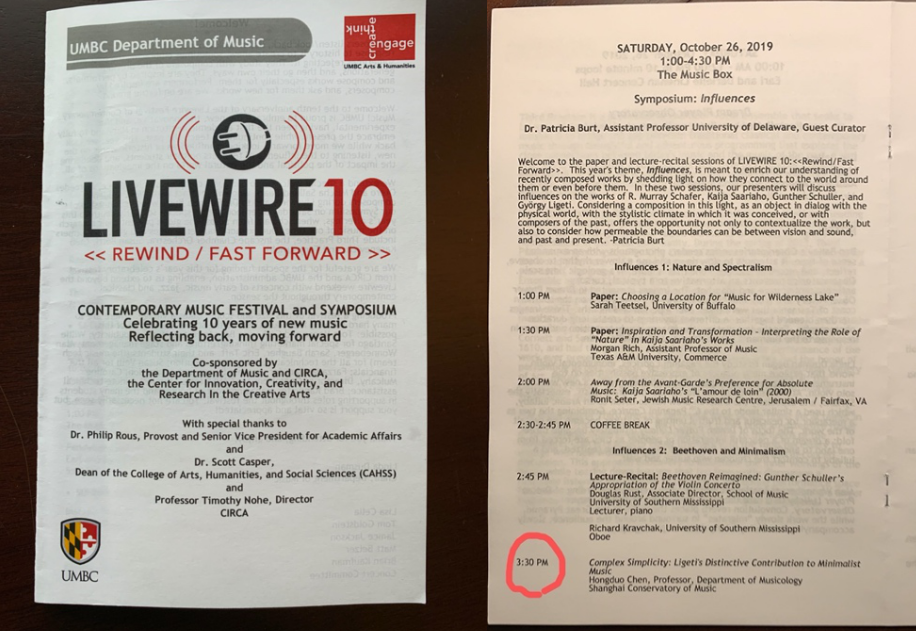 2019年10月24-27日,本系陈鸿铎教授赴美国巴尔的摩马里兰大学参加“美国第十届新音乐节暨研讨会”(The tenth annual new music festival and symposium, LIVEWIRE 10),此次会议的主题是: 回顾与展望(Rewind/Fast Forward),核心词是“影响”(Influence)。会议的目的是,通过对过去音乐发展过程和成绩的回顾,找出进一步推动音乐创作和理论研究向前发展的经验和动力。这是一个具有相当权威性及影响的国际性音乐活动,该活动包括传统与现代作品音乐会和理论研讨两大部分,陈鸿铎教授主要参加理论研讨部分。代表们通过宣读论文、工作坊以及新作品展示,进行相互交流和切磋,吸取各自来自不同角度的新思想、新方法和新成果。