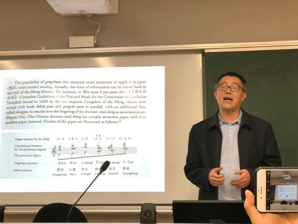 2019年11月7日,应公共基础部邀请,天津音乐学院外语教研室主任、音乐文献编译硕士生导师孔维锋副教授来上海音乐学院开设讲座。本次讲座得到学院课程思政扩大项目资金的支持,于13:30-15:00在零陵路校区1023教室进行。讲座题为“从《琴道》看中国音乐文献英译”。孔维锋老师从他参与汉译的荷兰汉学家高罗佩古琴专著《琴道》一书出发,介绍了从英语专著中进行无本回译的特点及难度,并选取古琴术语和琴谱示例展示中国音乐文化英译的一些技巧和策略。以此为出发点,孔老师继续选取了一篇关于中国散拍乐的音乐文献及其在《音乐中国》英文期刊中的译文进行了对比研究,重点从语篇翻译的角度引导听众注意到汉语和英语中不同的学术规范,以及在中国音乐文献英译时应注意的原则。他建议在通常采用的直译、意译、加译、译注等方法之外,还应考虑改译、变译等,使译文能符合国际学术规范。但对于文中引用的中国作者引文等,翻译则务必做到原文的内容和观点,不可改写。在讲座过程中,孔老师幽默风趣,旁征博引,引导听众思考关于中国音乐与西方音乐的差异以及恰当的翻译技巧,得到了外语教研室教师及学院本科、硕士和博士生的欢迎。