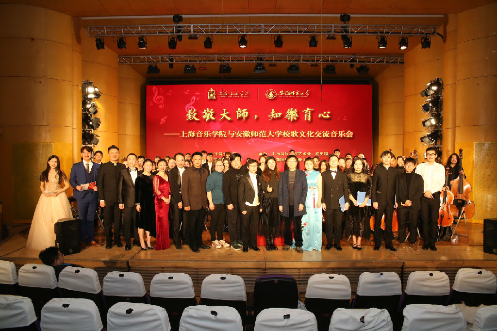 12月9日晚,由上海音乐学院、安徽师范大学主办,上海音乐学院艺术处、校史馆与安徽师范大学音乐学院联合承办的第36届上海之春国际音乐节暨2019年第五届上海音乐学院音乐开放周延伸项目:“致敬大师,知乐育心”——上音与中国高校校歌专题交流活动在安徽师范大学音乐学院成功举办。本次交流活动由上海音乐学院图书馆党支部书记张一带队,上海市学校艺术教育发展评估中心副主任倪燕,上海音乐学院校史馆副研究员肖阳以及我院校史馆“海尚音苑”志愿者社团的部分同学一同前往。