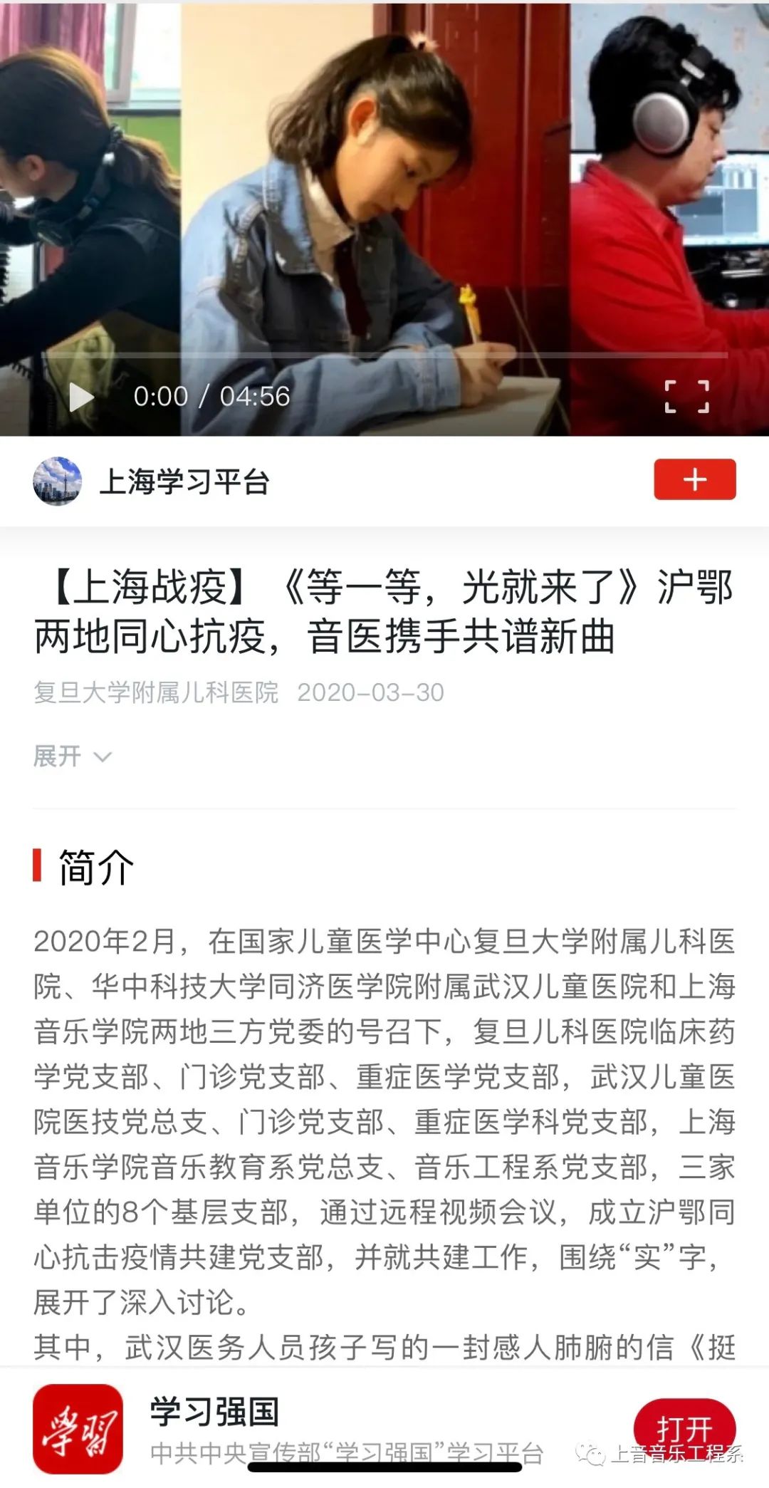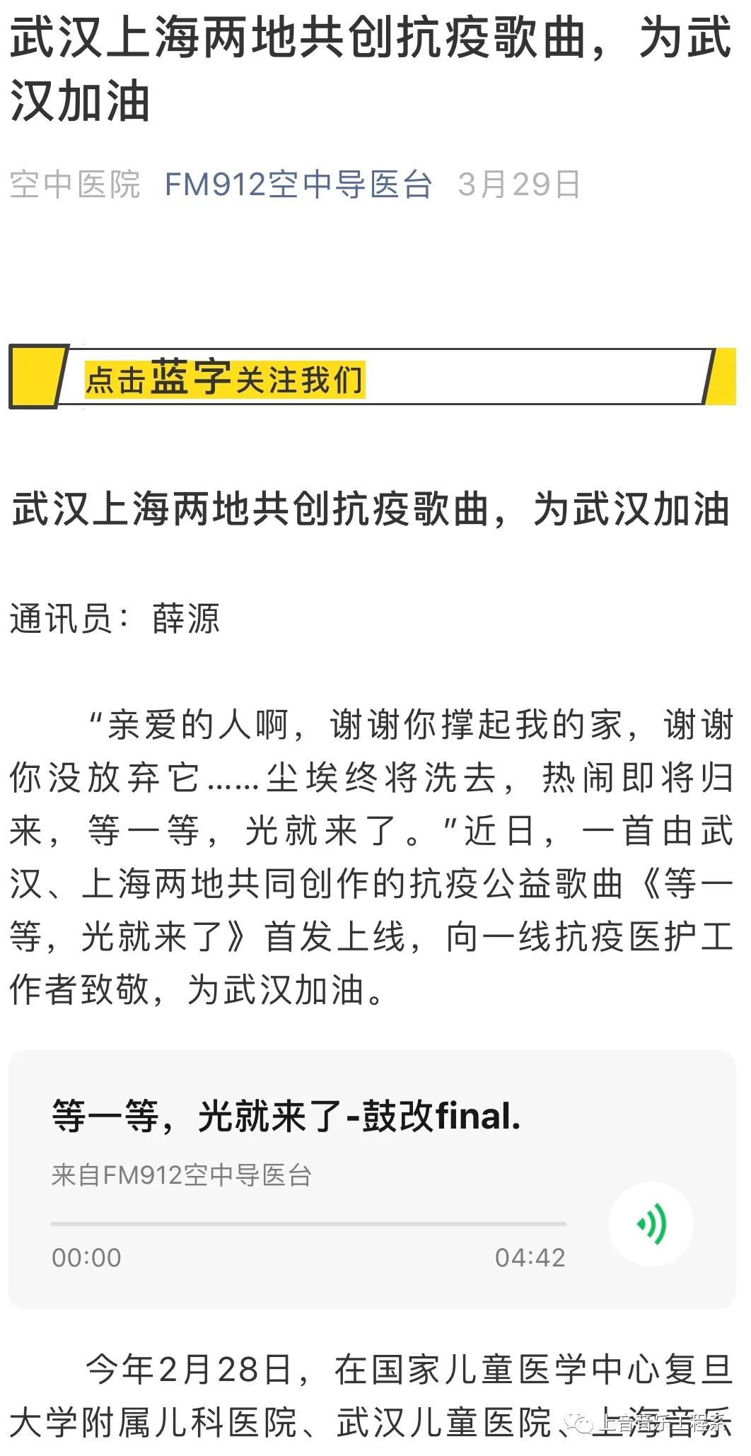 央视新闻再次对我院与复旦儿医、武汉儿童医院两地三方共建和我系创作歌曲进行了报道。自此曲推出后,不仅武汉、湖北、上海电台电视台等多家媒体进行了报道,并两次登上学习强国(湖北和上海平台),两度出镜央视新闻。正值武汉解禁,《等一等,光就来了》完美收官!