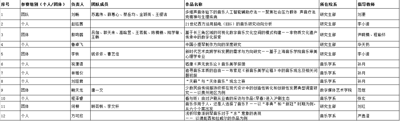 第十七届 “挑战杯”大学生课外学术科技作品竞赛上海音乐学院校内赛已结束,竞赛组委会组织专家,从项目科学性、先进性、现实意义等方面对参赛项目进行了认真评审,最终确定12件优秀项目作品推荐市赛,现将名单予以公示。公示期为5个工作日,自2021年4月15日至4月19日,公示期内若对结果有异议,请向校团委办公室反映,联系电话:64311430