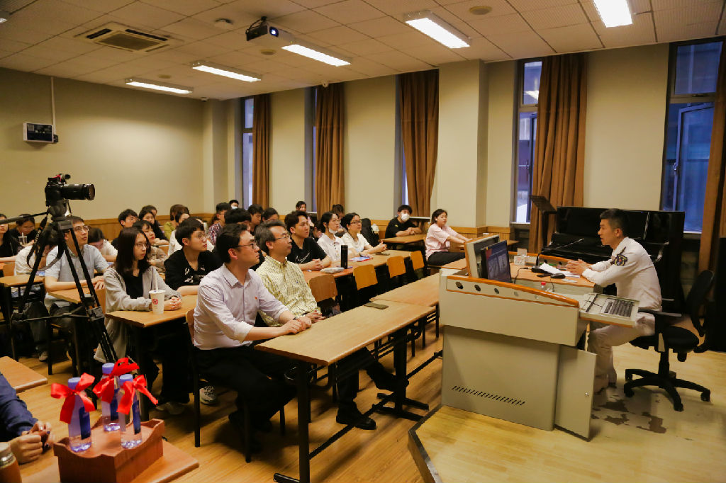 5月11日晚,上海音乐学院《习近平新时代中国特色社会主义思想概论》课程“习近平强军思想”专题开讲。海军南昌舰副政委罗代裕上校以“立身逐梦向深蓝”为主题与同学们开展座谈交流。