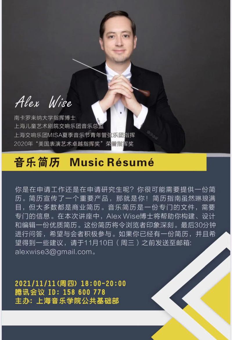 讲座由上海儿童艺术剧院交响乐团音乐总监、南卡罗莱纳大学指挥博士Alex Wise主讲。讲座以音乐简历的构建、设计和编辑为主题,细致分辨了音乐简历和其它简历、履历的异同,讲解其特有的形式与作用,内容和语言的要求。Wise博士还现场实例点评、分析并作修改学生提交的音乐简历,为上音学生提供了极具参考价值和实用意义的信息和指导。