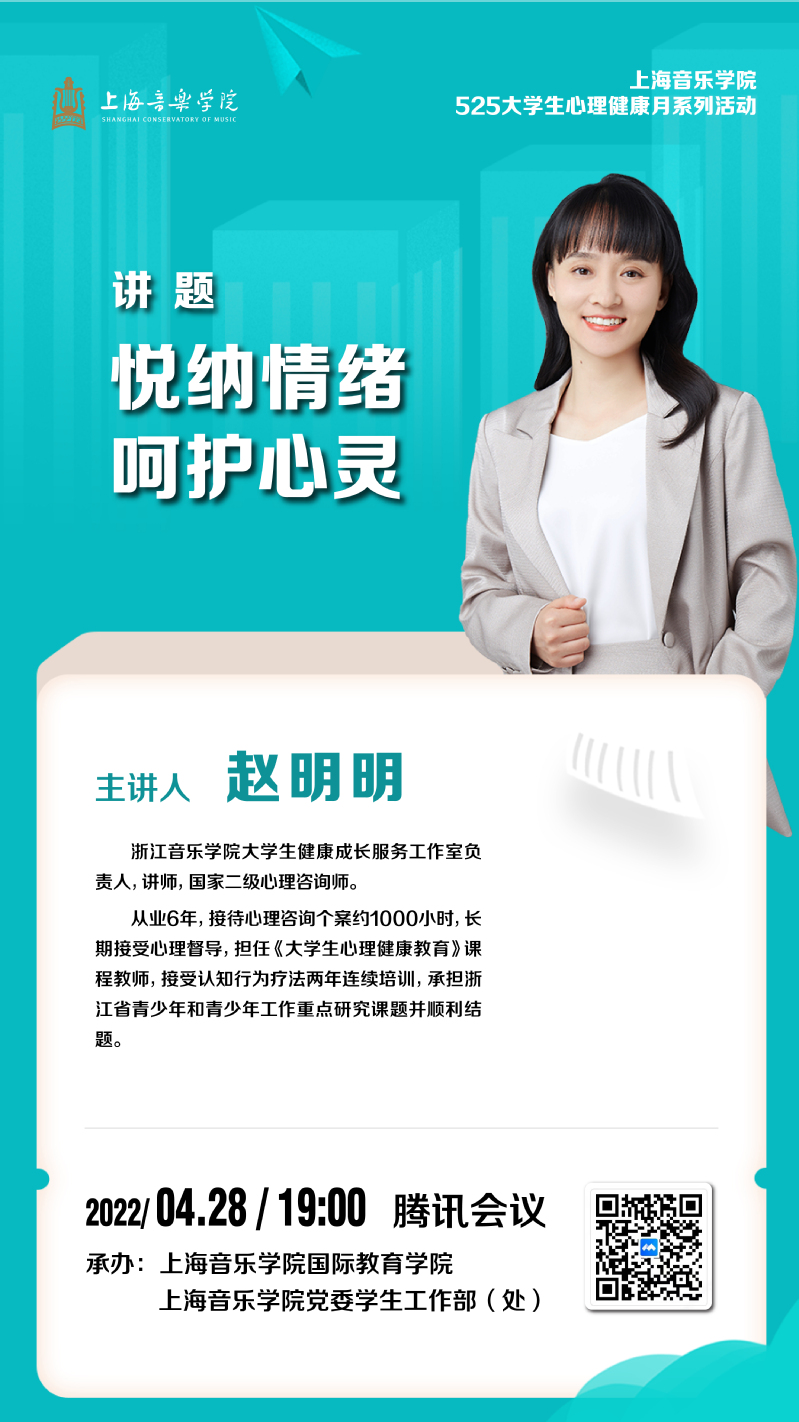 由上海音乐学院国际教育学院与党委学生工作部(处)合作开展的“悦纳情绪,呵护心灵”心理健康教育与疏导专题讲座于昨晚在线上顺利举办。讲座由浙江音乐学院大学生健康成长服务工作室负责人、国家二级心理咨询师、讲师赵明明老师主讲,吸引了上海音乐学院和上海戏剧学院的中外籍学生共计40名。