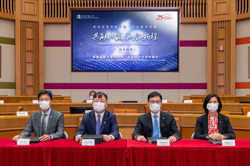 香港浸会大学领导签署合作协议。左起:副校长(教与学)周伟立博士、副校长(研究及拓展)郭毅可教授、暂任常务副校长黄伟国教授、行政副校长暨秘书长邹霭云女士。