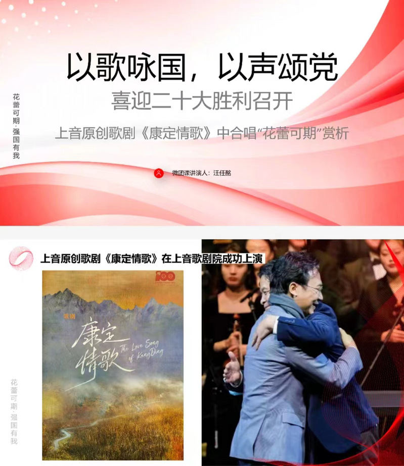 陈京蔚老师主讲的《培根铸魂心向党,启航奋斗新征程》;汪任酩老师主讲的《以歌咏国,以声颂党,喜迎二十大胜利召开——上音原创歌剧〈康定情歌〉中合唱“花蕾可期赏析》;陈家坡老师主讲的《一起抗疫,音为有你》;刘辰旭同学主讲的《聆听百年回响——欣赏新时代民族歌剧〈贺绿汀〉》;张曦同学主讲的《传世佳作,红扬百年——品长征组歌第四曲“四渡赤水出奇兵”》。
