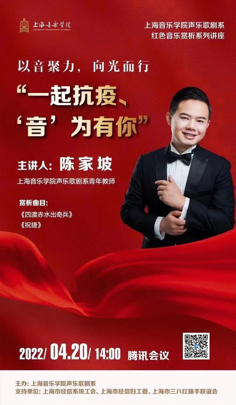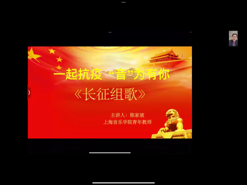 上海音乐学院声乐歌剧系青年教师陈家坡的课题为“一起抗疫,'音'为有你”。陈家坡老师作为上海音乐学院新时代版《长征组歌》中《祝捷》片段的演唱者之一,得到了观众们的一致好评。许多老师和同学们也参与到了《长征组歌》的演出当中,所以陈家坡老师在课堂上非常开心地与同学们分享了自己的演出心得与感悟。