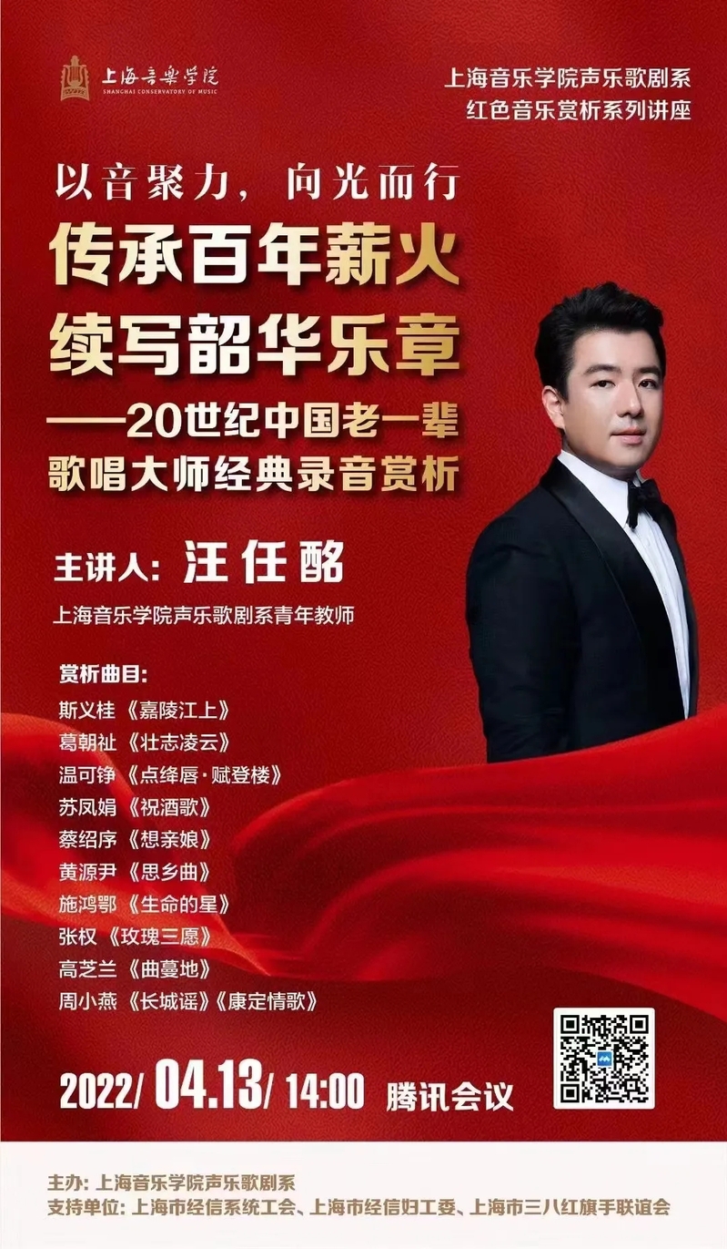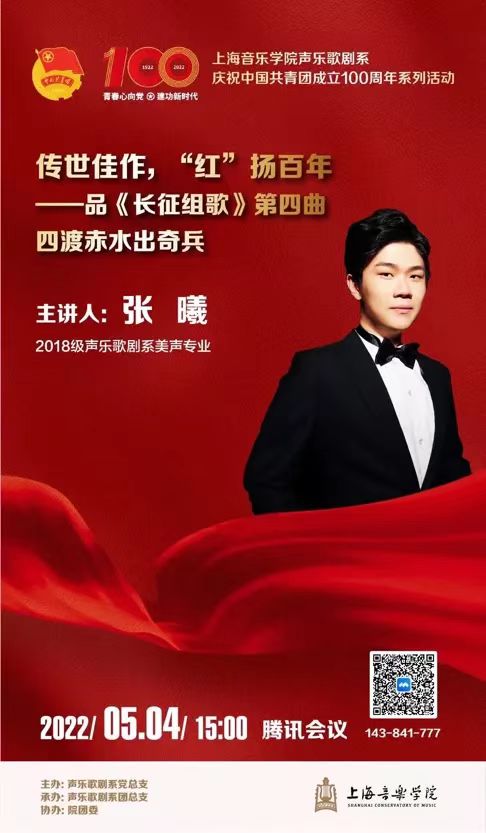2022年5月4日,上海音乐学院声乐歌剧系本科四年级同学张曦在线上举办了以“传世佳作,‘红’扬百年——品长征组歌第四曲‘四渡赤水出奇兵’”为题的微团课学习分享。张曦同学作为新时代版《长征组歌》片段《四渡赤水出奇兵》的演唱者之一,通过这次微团课将收获与同学们一起分享。
