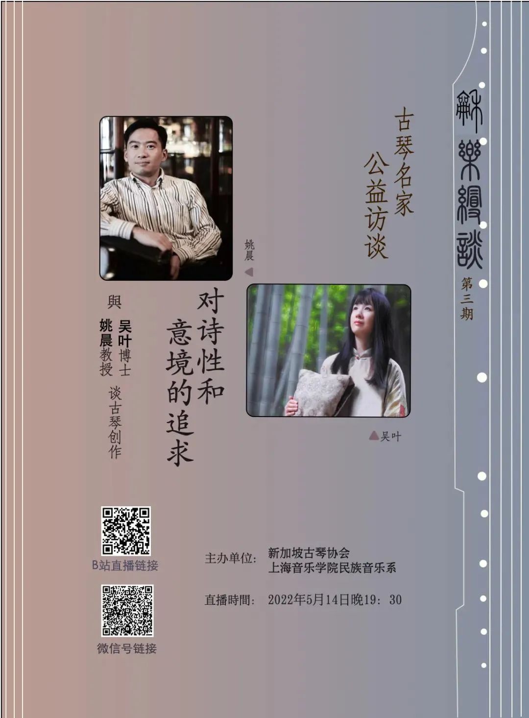 一位是留洋多年、获得许多国际音乐奖项的作曲“洋”博士,一位是土生土长传统音乐的音乐学博士,他们将会碰撞出怎样的火花?保护琴统,还是剑走偏锋?回溯历史,还是对话未来?独来独往,还是中西合璧?敬请关注5月14日晚7:30,新加坡古琴协会钟之岳会长对话吴叶博士与姚晨教授——“对诗性和意境的追求”。