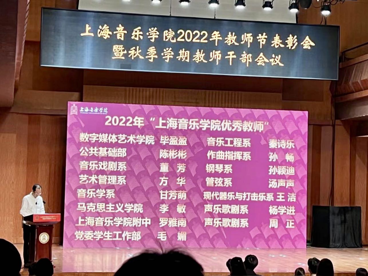 会上对2021-2022学年获奖教职工进行集中表彰。其中公共基础部外语教师陈彬彬荣获“上海音乐学院优秀教师“称号。