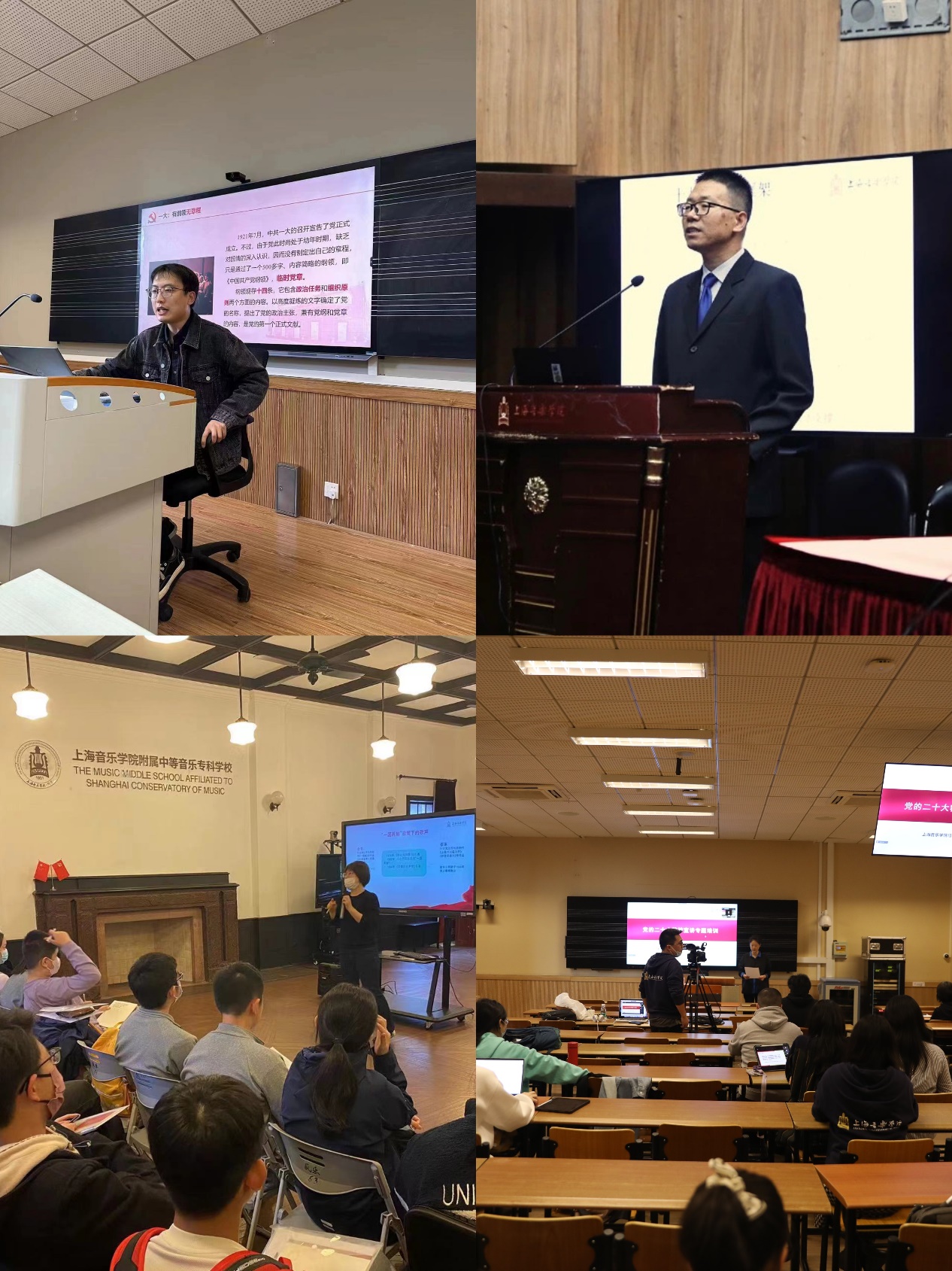 党委宣传部副部长、马克思主义学院公共基础部联合党支部副书记、马克思主义学院院长张卓分别于11月9日、14日、16日赴音乐学系党支部、直属单位党总支、机关党委第五党支部、音乐学系大学生团学骨干训练营,音乐戏剧系党支部、声乐歌剧系党总支,2022年上音新进教职工岗位培训班作题为《二十大报告解读》专题讲座,从党的二十大主题、过去五年的工作和新时代十年的伟大变革、习近平新时代中国特色社会主义思想开辟了马克思主义中国化时代化新境界、中国式现代化的中国特色和本质要求、全面建设社会主义现代化国家的新部署新要求、以伟大自我革命引领伟大社会革命的重要要求等方面全面系统讲解了党的二十大精神。同时,对习近平总书记关于教育科技人才、文化文艺、青年的重要论述和考察上海重要讲话精神四个方面做了重点交流分享。