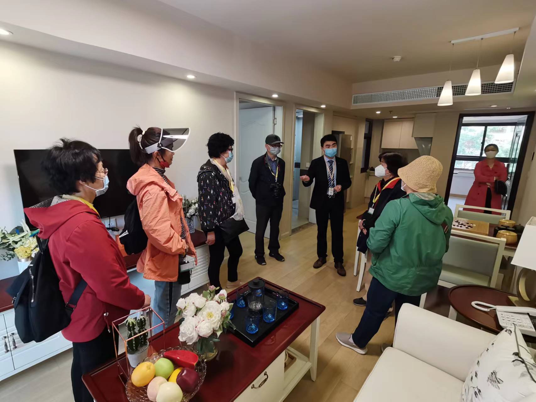 在工作人员的引领安排下,上音老教授一行分成五组全方位考察了绿地国际康养城。这个由世界500强企业绿地集团投资近30个亿精心打造而成的养老社区,以颐贤、颐身、颐年、颐神、颐家、颐志为名,分别对应养老服务中的社会照料、健康保健、医疗保障、娱乐社交、智能安康和文化服务六大功能。不同于一般的养老院,康养城采用会员制模式,在缴纳一百二十万至二百余万的会费后,即拥有一套一居室至二居室的养老产权房。康养城里的娱乐活动室也十分齐全,一间间宽敞明亮的教室,唱歌、舞蹈、书画、棋牌、乒乓球、桌球等都有专用的房间。参观过程中大家饶有兴趣地一一询问相关的问题,有些老同志也有购买的意向。