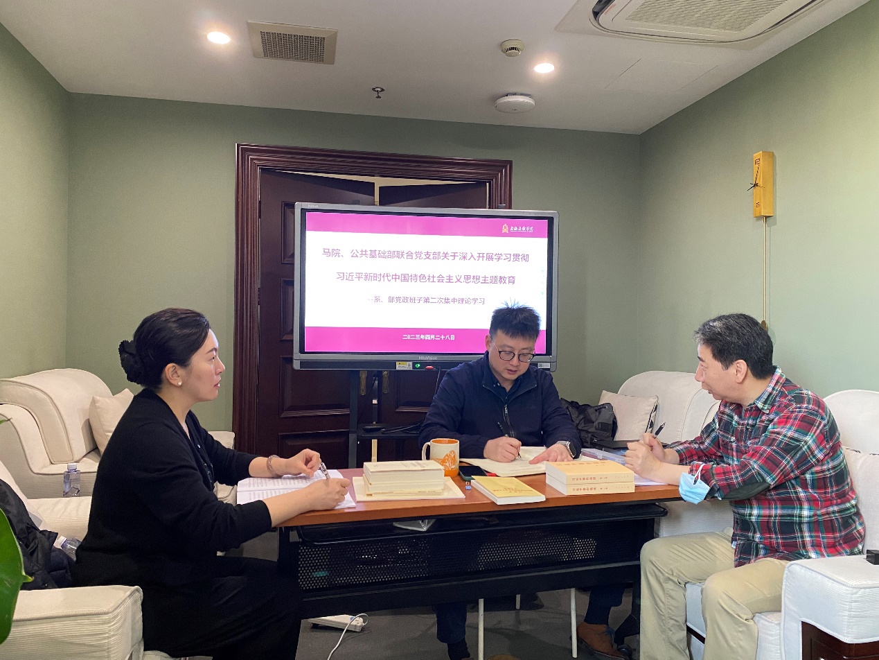 马院、公共基础部联合党支部认真对照上海音乐学院学习贯彻习近平新时代中国特色社会主义思想主题教育工作要求,抓好理论学习,统一思想认识。4月28日上午,支部党政班子于汾阳路408旁小会议室开展第二次集中理论学习。会议由支部副书记张锷主持,书记汤隽杰,副书记、马克思主义学院院长张卓参加本次学习。理论学习以“学习导读+重点交流发言”的形式开展。