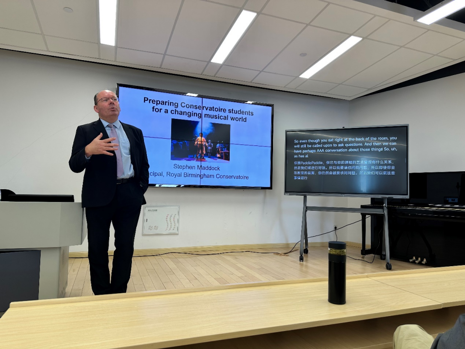 斯蒂芬·马多克对上音的热情接待表示感谢,并对上音近年来的发展成就表达了赞赏。他曾任伯明翰市立交响乐团(CBSO)首席执行官长达24年,并于今年5月新任皇家伯明翰音乐学院院长。马多克认为,未来的音乐艺术人才乃至顶尖音乐家,不仅需要艺术专业领域的精进,更需要注重综合素养的全面提升。他指出,伯明翰是一个对中国学生非常友好的城市,希望未来两校开展更多学术互鉴、师生交换方面的交流与合作。