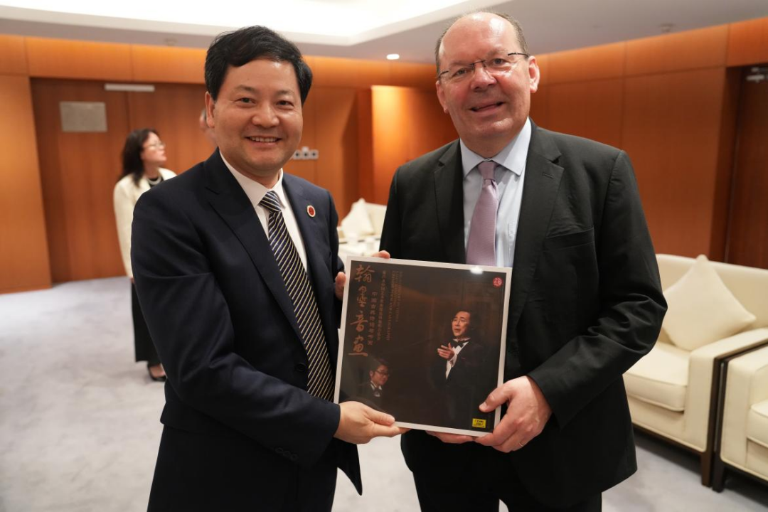 侯立玉向斯蒂芬·马多克院长赠送《翰墨音画:中国古典诗词与书画廖昌永中国艺术歌曲维也纳独唱音乐会》唱片。
