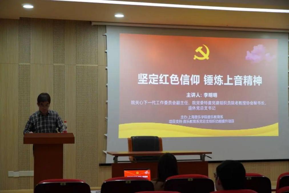 大学生入党启蒙教育是高校党的建设的源头工作,是对大学生思想政治引领、筑牢理想信念根据的基础性工作,为抓好新生入学的“关键期”,激发同学们的爱党爱国精神,2023年10月25日下午,上海音乐学院音乐教育系关工委分会对新生开展入党启蒙教育,由上海音乐学院关工委副主任,院党委特邀党建组织员、院老教授协会秘书长、退休党总支书记李明明老师担任主讲,开展了主题为“坚定红色信仰 锤炼上音精神”的2023级新生入党启蒙教育活动。讲座由上海音乐学院音乐教育系关工委分会副主任、党总支副书记向征老师主持,音乐教育系关工委分会主任、党总支书记曾敏老师出席活动。