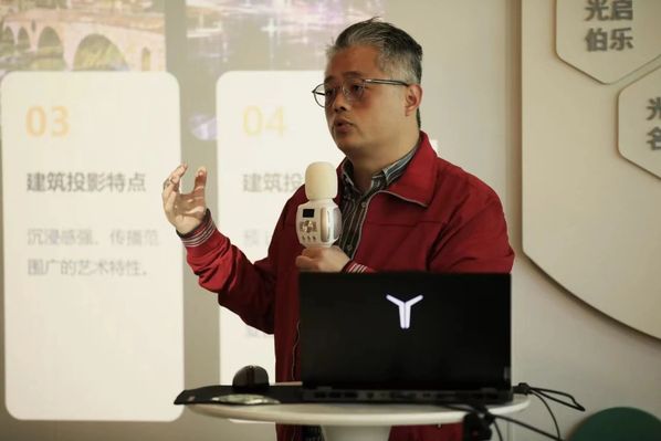 唐老师从摄影投影的基本概念的出发,介绍了建筑投影的制作流程、特点及其发展趋势,结合国内外著名的光影节活动,唐老师谈到建筑投影灯光秀作为一种新兴的艺术形式,以其独特的视觉冲击力为城市注入了新的活力与魅力。灯光秀不仅有助于文化遗产的展示,更对经济发展起到了积极的推动作用。建筑投影不是一种简单的投影技术,而是涉及到图像处理、光影设计、建筑立面分析等多个环节的复杂过程。每一个细节的处理,每一次光影的调试,都需要经过精心的设计和反复的试验。夜晚城市建筑的外墙被五彩斑斓的光影所覆盖,通过精准的光影投射与细腻的色彩渲染,建筑投影能够将静态的建筑转化为动态的艺术品,成为了城市文化的一张亮丽名片。