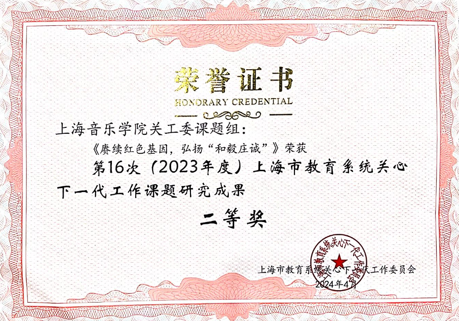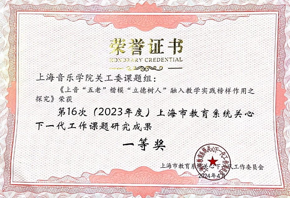 2023年,上音关工委以习近平关心下一代工作重要指示、党的二十大精神为引领,学习贯彻落实中办国办46号文、教育部党组34号文和市教卫工作党委201号文精神,注重发挥老同志政治、经验、理论优势,积极开展课题研究。获得此项荣誉,是对我院关工委工作的肯定和鼓励,我们将再接再厉,继续深化关工委工作,积极探索新时代新路径,为培养更多优秀的艺术人才做出更大的贡献。