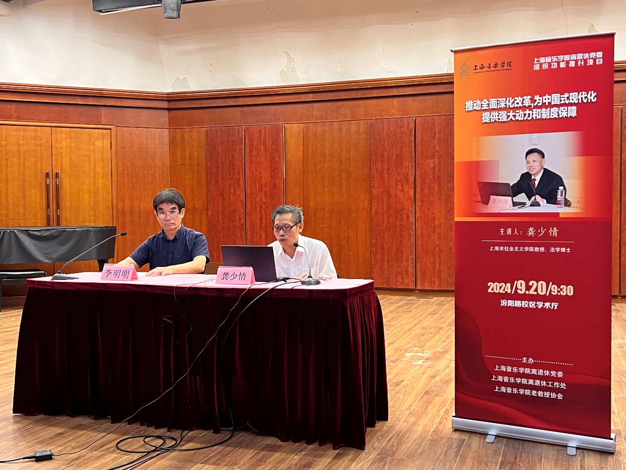 为了帮助大家更好地学习贯彻党的二十届三中全会精神,2024年9月20日上午,上海音乐学院离退休党委、离退休工作处、老教授协会联合举办“推动全面深化改革,为中国式现代化提供强大动力和制度保障”专题辅导报告会,特别邀请上海市社会主义学院教授、法学博士龚少情主讲。报告会由离退休党委副书记、老教授协会秘书长李明明主持。
