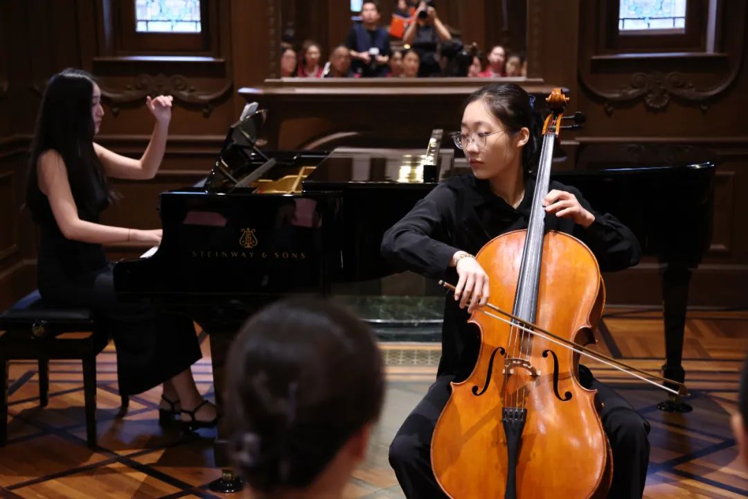 在简短而庄重的仪式后,一场小型作品音乐会缓缓展开。韩云琪、吴琳敏、陈炯然、周润野四位同学唱响校歌《国立音乐院院歌》,熟悉的旋律唤起了在场师生对学校的深厚情感。陈炯然与沈辛怡副教授合作演绎了艺术歌曲《问》与《南飞之燕语》,细腻表达了萧友梅作品中的深情与哲思。沈郝与纪晓澜带来的大提琴协奏与钢琴《秋思》,每一个音符都在诉说着对萧友梅先生的崇高敬仰。