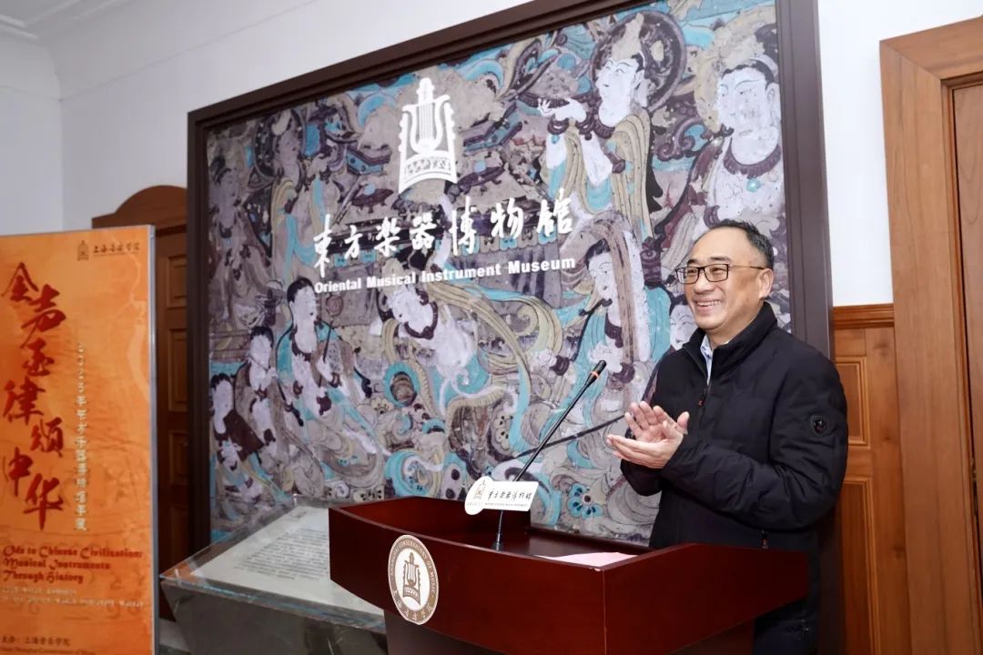 上音党委书记裴小倩、院长廖昌永、党委副书记徐卫,原院长江明惇、东方乐器博物馆原馆长应有勤、史寅,学校相关职能部门负责人、师生代表等共同参加。徐卫致辞,他表示:“学校积极统筹推进城市音乐会客厅、美育楼(东方乐器博物馆)、音乐城堡开展高品质艺术特展和艺术活动,为市民带来更加丰富的文化体验。”