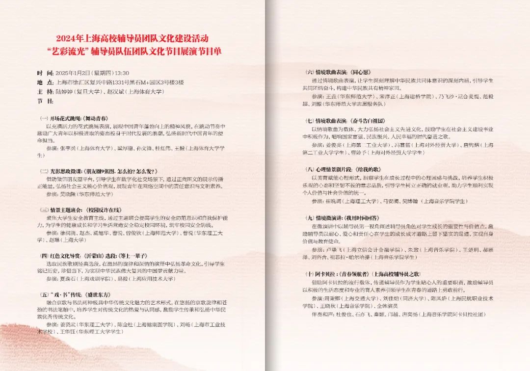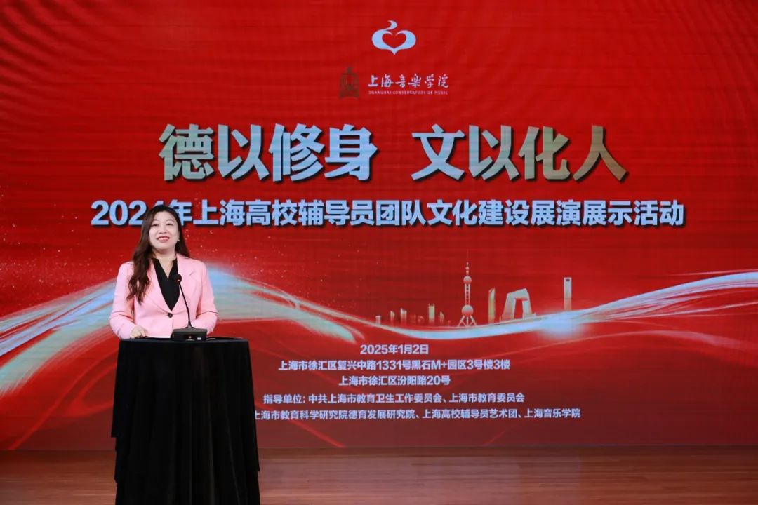 为深入学习贯彻党的二十大、二十届三中全会和全国教育大会精神,推动高校辅导员队伍专业化职业化专家化发展,进一步提升高校辅导员文化修为和美育素养,2025年1月2日,由中共上海市教育卫生工作委员会、上海市教育委员会指导,上海市教育科学研究院德育发展研究院、上海高校辅导员艺术团、上海音乐学院主办的“2024年上海高校辅导员团队文化建设活动团队文化建设展演展示活动”在上海音乐学院所在的衡复音乐街区举行。本次活动围绕“德以修身,文以化人”主题,吸引了沪上高校百余名辅导员齐聚上音,共同探讨以文化艺术手段增强思政教育吸引力、感染力的创新路径。上海市教委德育处处长朱敏、上海音乐学院党委副书记徐卫、各高校学(研)工部相关负责同志及辅导员代表近百人出席活动。活动由院党委学生(研究生)工作部部长欧阳佳沁主持。 徐卫结合学校办学实际,指出学校以“音乐+思政”为突破口,充分发挥学科专业优势,推出“行走的音乐思政”“音乐党课”等思政品牌,带动实现讲台与舞台相融合、思政与业务相融合、课程思政与艺术创作相融合。通过一系列举措,在“德艺双馨”拔尖创新人才培养上取得了显著成效;勉励辅导员老师通过优秀文化艺术涵养自身品德修为,提升自我鉴赏力和综合素质,探索思政育人新方法,以增强思政工作的亲和力、感染力和吸引力。 朱敏在讲话中对上海音乐学院及各参演参展团队为筹办此次活动所作的努力给予了高度评价,并结合上海市教委新发布的《全面加强新时代高校辅导员队伍建设专项行动实施方案》同与会师生进行了深入交流。朱敏激励辅导员老师牢记“矢志忠诚、立德树人、敬业爱生、明理笃行”的上海高校辅导员核心价值取向,以立德树人播撒初心火种,以强化“内功”守护青春力量,为培养肩负民族复兴重任的时代新人作出新的贡献。 本次辅导员团队展演展示活动由“艺彩流光”节目展演和“书香雅卷”作品展示两部分构成,来自复旦大学、同济大学、上海交通大学、华东师范大学、华东理工大学、上海音乐学院、上海戏剧学院等沪上高校共同参加。活动设计注重创新性和交流性,在一动一静的艺术交错中探索辅导员以文化艺术形式赋能思政工作的创新路径,共同感悟“德行”之高远与“文化”之深厚。 “艺彩流光”团队文化节目展演展现了上海高校辅导员们深厚的文化素养和昂扬的精神风貌,展示让传统文化与现代生活对接,体现了辅导员对马克思主义“魂脉”的坚守和对中华优秀传统文化“根脉”的传承。通过树立爱国主义情怀、铸牢中华民族共同体意识、弘扬传统文化精神、增强心理健康、提升安全防诈意识等思政点,载以光影微课、主题班会、主题党日、微演讲、情景歌舞表演等多样化形式,从宏观到微观,从整体到局部、从团体到个人,以美育人、以美化人、以美培元,通过优秀文化艺术涵养辅导员品德修为,提升自我鉴赏力和综合素质,探讨“德”与“文”如何在思政工作中实现“润物细无声”。 “书香雅卷”文化作品在上海音乐学院“音乐城堡”展出,展览通过绘画、摄影、书法等表现形式展示思政工作铸魂育人成效,体现了近年来辅导员队伍团队文化建设成果。在书法展区,辅导员老师的书法作品或工整、或洒脱,展现出独特的艺术魅力;绘画展区既有传统国画的细腻笔触,也有现代风格的创意表达;摄影展区由一张张精美的图片组成,记录了辅导员思政工作中的点滴美好和精彩瞬间。随后,学校还组织辅导员老师前往“城市会客厅”“东方乐器博物馆”和“美育楼”等淮海路校区历史保护建筑参观。 未来,在上海市教卫党委、市教委指导下,上海音乐学院将继续发挥专业特长和学科优势,开展更多创新性的交流研习研讨活动,以沉浸式美育体验与理论研修助力辅导员文化艺术素养提升,助力上海高校辅导员队伍建设专业化发展,推动沪上高校开创思政工作新局面!