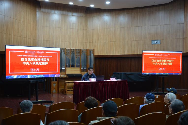 为扎实开展深入贯彻中央八项规定精神学习教育,引导离退休教职工深刻领会新时代新征程党和国家事业发展新要求,政治学习不掉队,作风建设不停歇,2025年4月22日上午,离退休党委、离退休工作处举办“以自我革命精神践行中央八项规定精神”专题讲座。主讲人魏华,法学博士,马克思主义理论博士后,上海交通大学马克思主义学院副院长,马克思主义中国化学科负责人,副教授。原院党委书记、院长江明惇出席,广大离退休党员和教职工积极报名参加学习。活动由离退休党委书记、离退休工作处处长易慧主持。