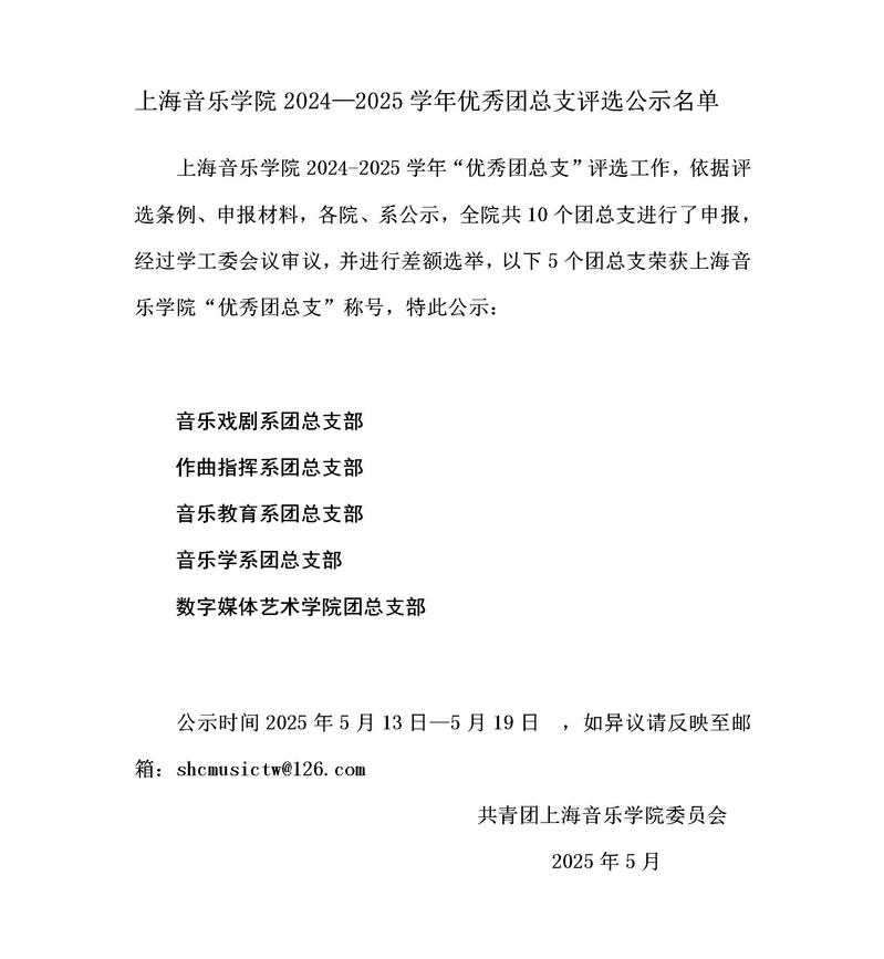上海音乐学院2024—2025学年优秀团总支评选公示名单