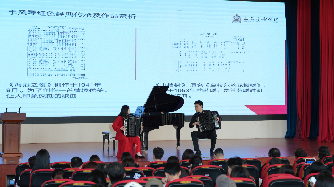 上海音乐学院关工委青年教师及硕博学生团队接力带来红色经典演绎:廉子成、朱政与学生们共同奏响钢琴协奏曲《保卫黄河》,用激昂旋律重现民族抗争史诗;手风琴演奏《我为祖国守大桥》、男生独唱《草原上升起不落的太阳》等节目,以艺术之美滋养心灵;朱政老师以"忆手风琴红色往昔"为题,串联起乐器传播史与革命奋斗史,打造别开生面的音乐思政课堂;廉子成老师现场教唱原创《廉政歌》,将廉洁教育融入音乐旋律,推动全场气氛达到高潮。