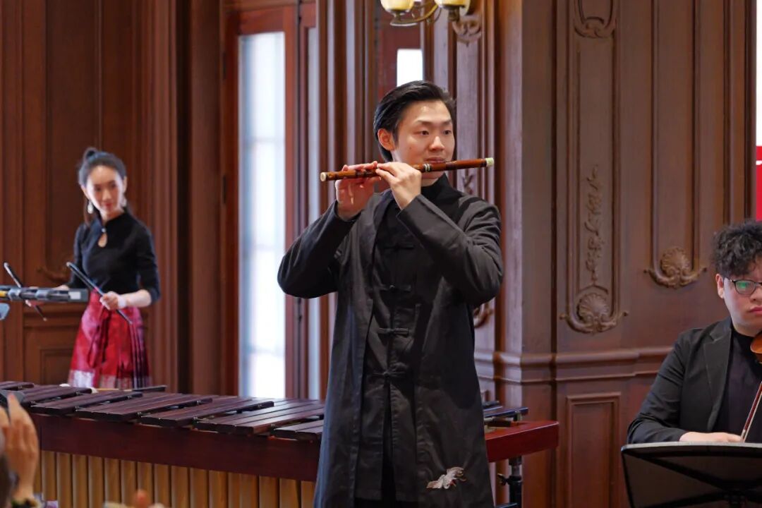 音乐会开篇,竹笛博士生陈善治吹响《扬鞭催马运粮忙》,笛声清脆、喜气洋洋;紧随其后,莫扎特经典歌剧《费加罗的婚礼》序曲磅礴登场,西方古典的灵动与典雅,尽显中西音乐对话的妙趣。