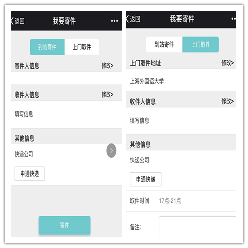 为方便在校师生寄件,递易校园站点统一采用电子面单,在校师生在微信后台填写完毕后,直接在柜台打印电子面单粘贴即可;针对部分师生大型包裹或时间不方便的痛点,微信平台支持在校师生预约上门取件,进一步为在校师生提供便利。