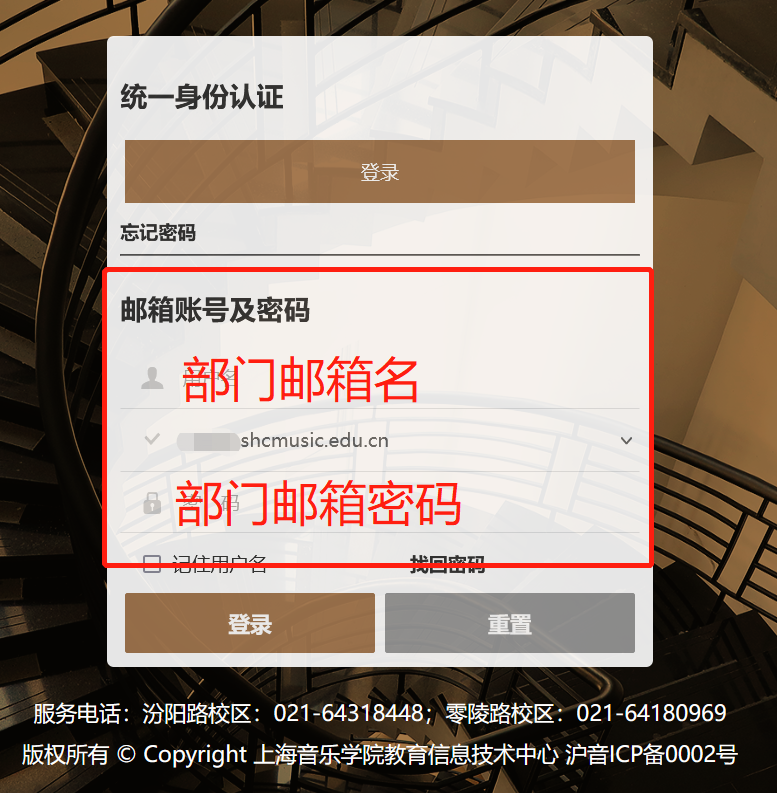 (二)PC终端访问 客户端支持POP3、SMTP、IMAP、Exchange同步服务协议,服务器及端口配置信息如下: 1、POP3服务器:pophz.qiye.163.com,不加密端口 110,加密端口 995 2、IMAP服务器:imaphz.qiye.163.com,不加密端口 143,加密端口 993 3、SMTP服务器:smtphz.qiye.163.com,不加密端口 25,加密端口号为 994、465、587 4、Exchange同步服务器:exchangehz.qiye.163.com(注意:用户名需要填写完整的邮件地址) 二、部门电子邮件服务的访问方式如下: (一)网页访问 1. 学校邮箱域名:https://mail.shcmusic.edu.cn/,在登录界面输入部门邮箱用户和密码,点击登录。