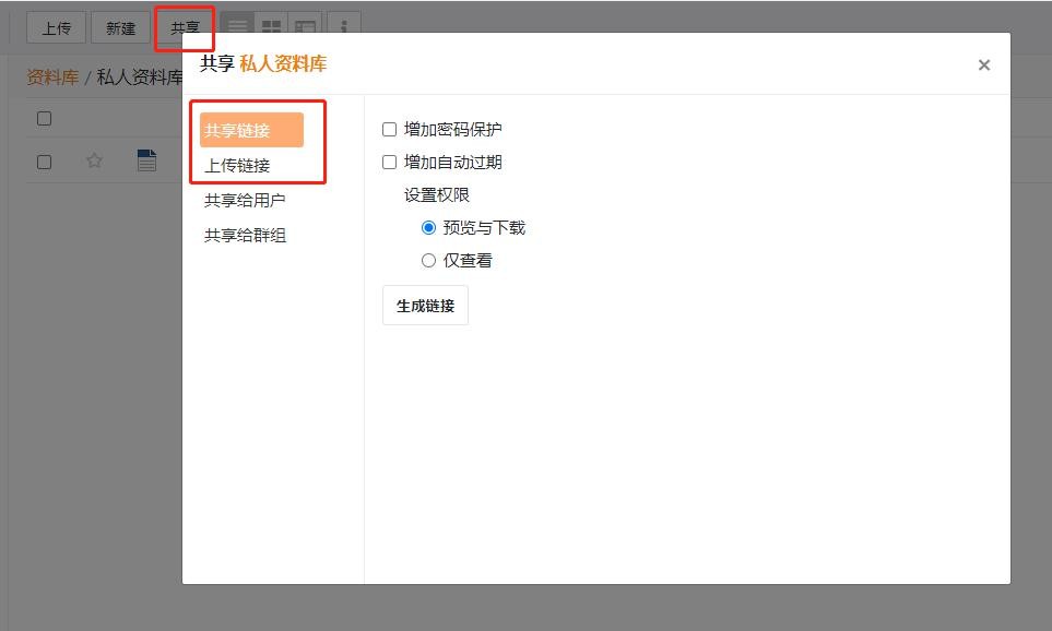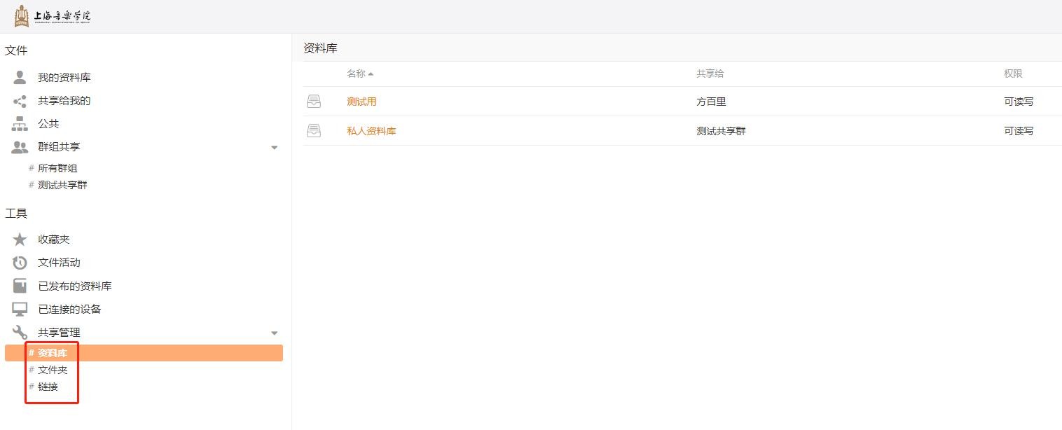 管理本人共享的资料库、文件夹、链接等。