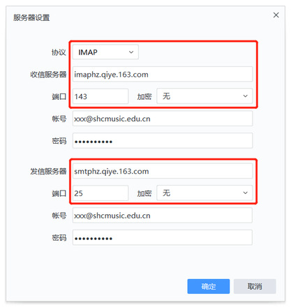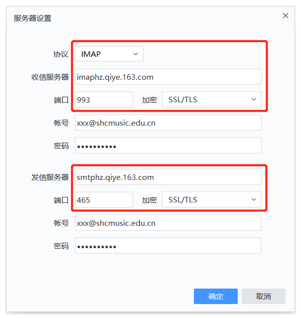 接收邮件服务器:imaphz.qiye.163.com 勾选“SSL”时,端口号:993