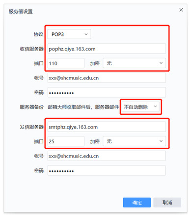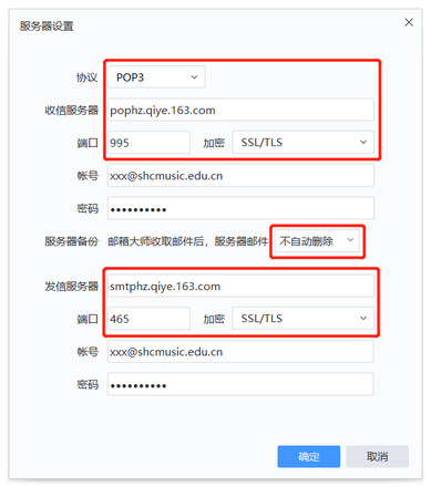接收邮件服务器:pophz.qiye.163.com 勾选“SSL”时,端口号:995